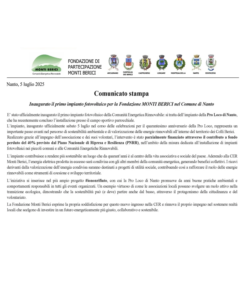 Comunicato stampa: inaugurato il primo impianto fotovoltaico nel Comune di Nanto
